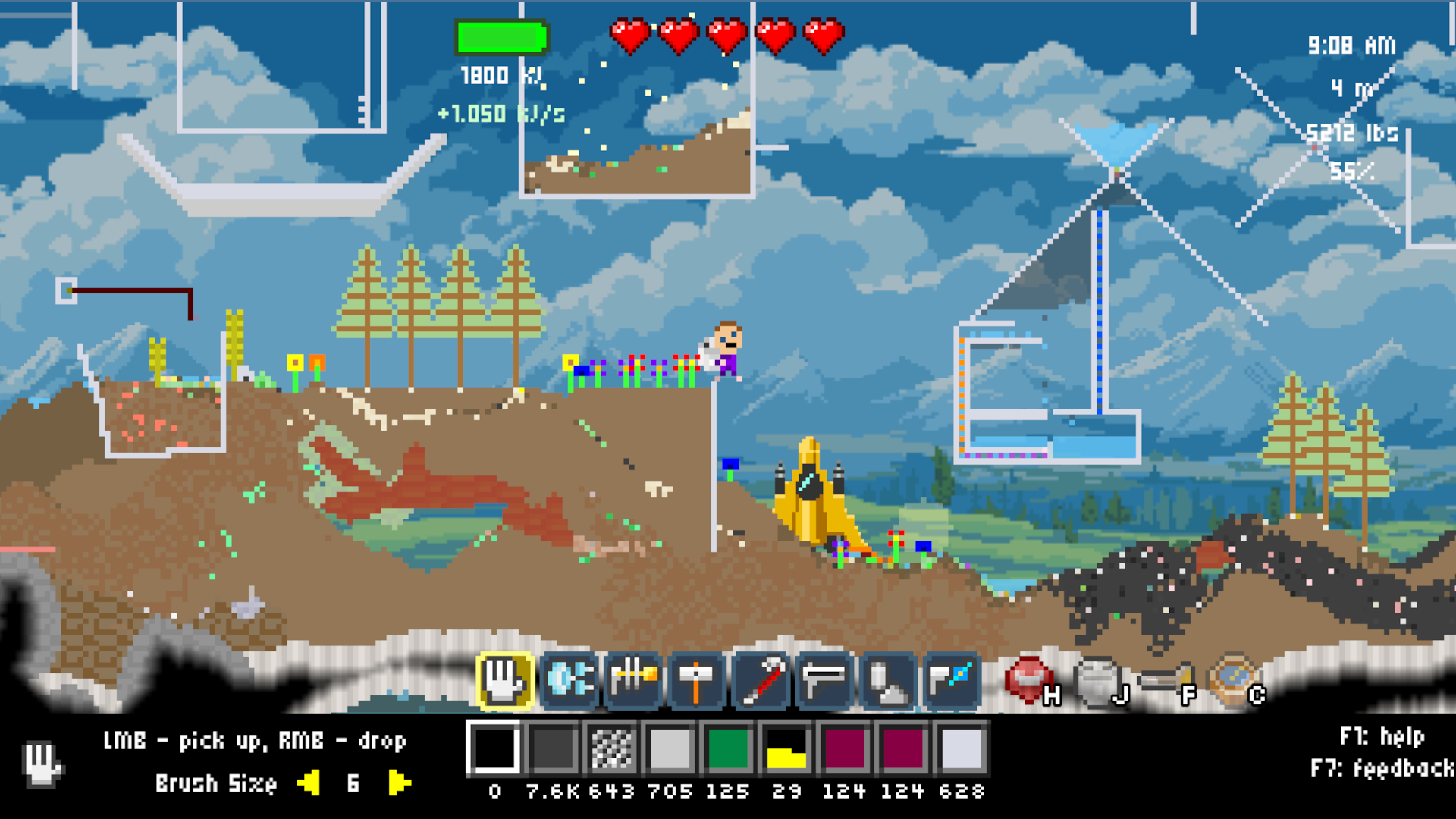 Atomcraft is a game where you can pick up and place every pixel of the environment. Pixels react to whatever is around them, and you can build vessels and machines to make reactions happen.